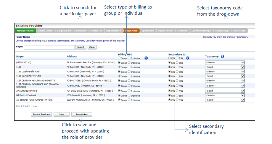 | 13. | On the Payer Rules page, edit the Billing NPI, Secondary Id, and Taxonomy details for various payers of the provider if necessary. |