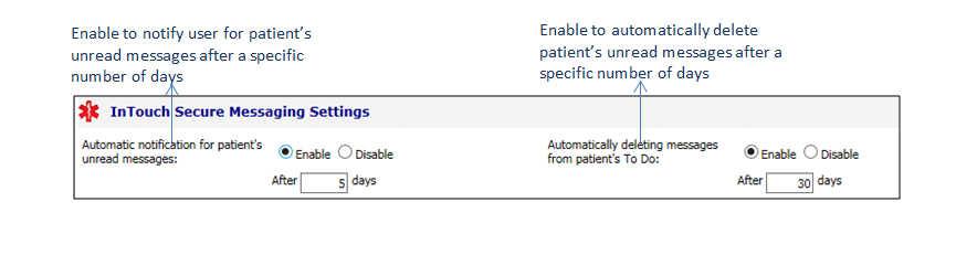 Automatically deleting messages from patient’s To Do: If you want to delete the Inbox messages automatically after specific number of days, select Enable, and provide a number of days in the box below. If you do not wish to delete the messages automatically, select the Disable option.